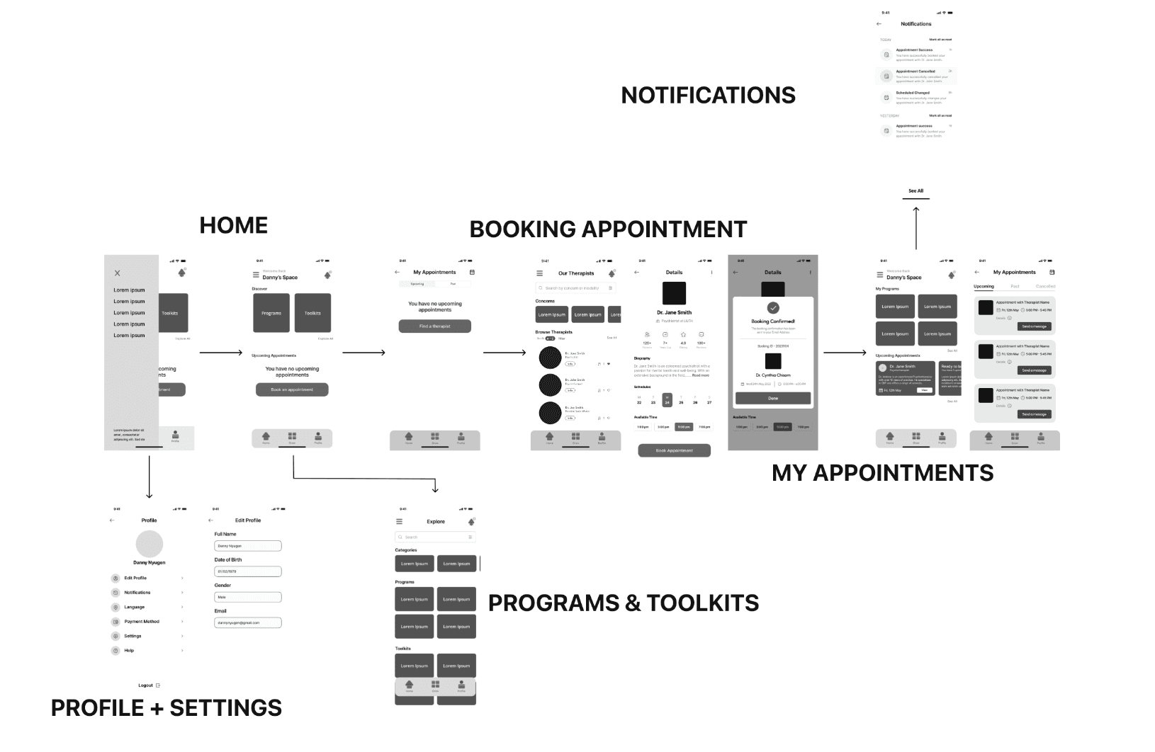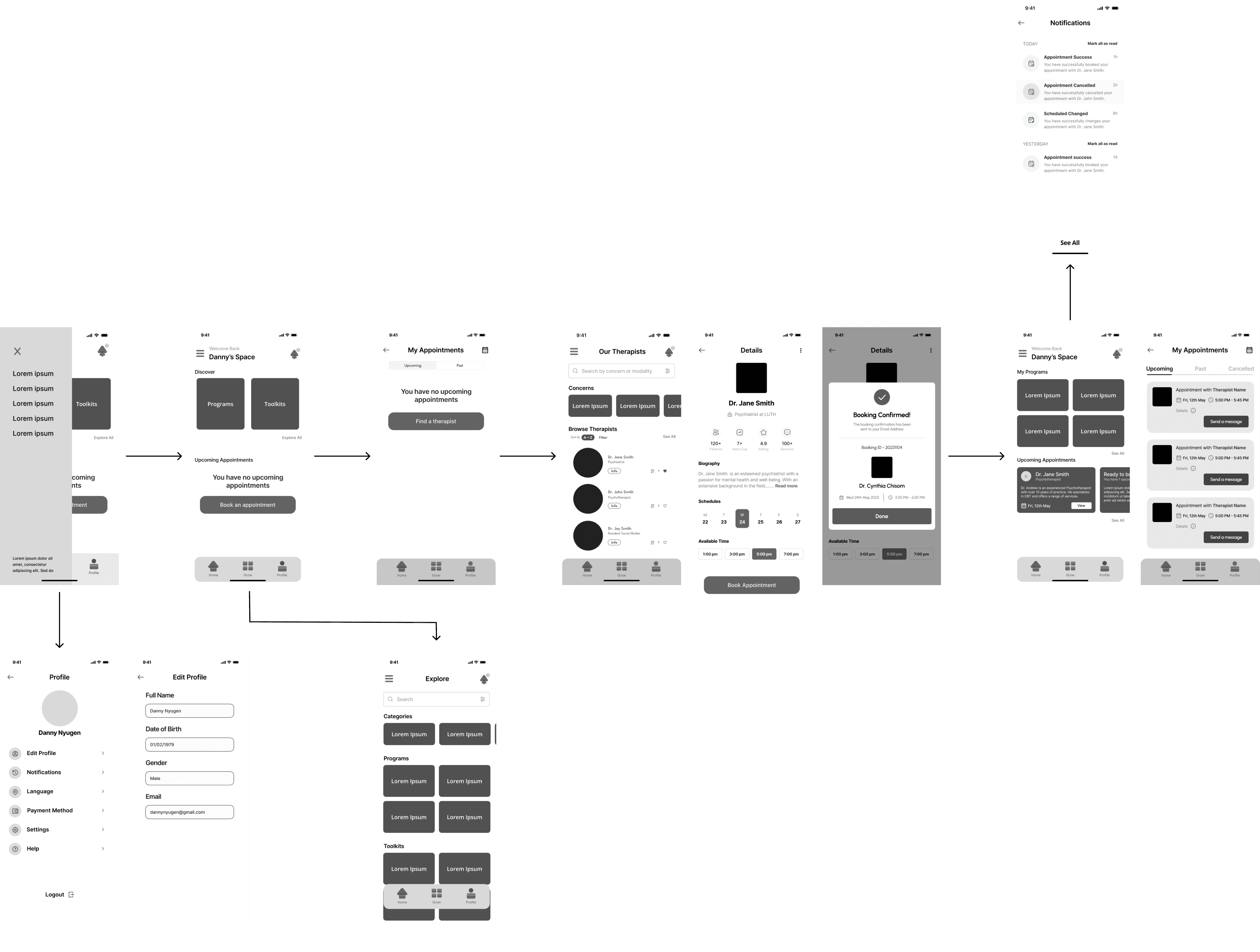 I moved into wireframes once the layout made sense. Greyscale only. I built out flows for onboarding, therapist discovery, and booking. Everything was designed to be easy to move through.